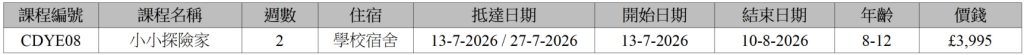 「小小探險家」課程專為8-12歲兒童設計,是一個為期兩週的全英語住宿夏令營。課程由語言專家精心打造,摒棄傳統課本教學,透過「Discover(發現)、Develop(發展)、Dare(挑戰)、Showtime(展現)」四大環節,將學習融入科學實驗、歷史探索、創意藝術等趣味活動中。孩子們將在安全、關愛的環境中被鼓勵成為勇敢、好奇的小冒險家,從容運用英語溝通,培養獨立性與自信心。課餘時間可選擇參與運動、STEM挑戰、才藝表演等多元活動,並在樂高樂園、華威城堡及牛津博物館的校外教學中親身探索世界。營地24小時專業照顧,讓孩子在結交國際朋友的同時,收穫難忘的夏日成長回憶。