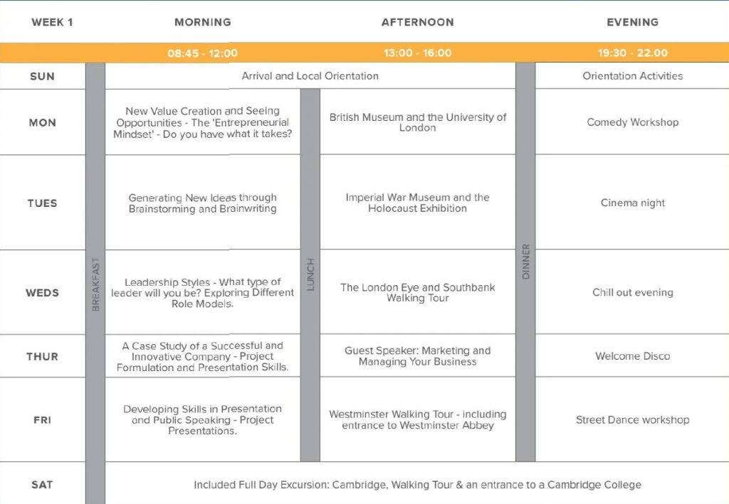 Learning extends beyond the classroom with dynamic onsite activities and four half-day plus one full-day excursion per week across London (including a travel pass). Guided tours of museums and landmarks transform the city into a living classroom. The program culminates in a final business pitch competition, where students simulate the complete journey from strategy to presentation.